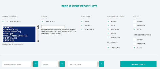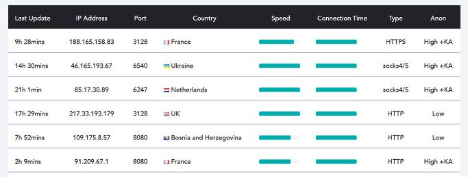 해당 사이트에 접속하면 프록시 서버 리스트가 나오는데 ip, port, 국가, 속도, 프로토콜 타입등을 알 수 있다.